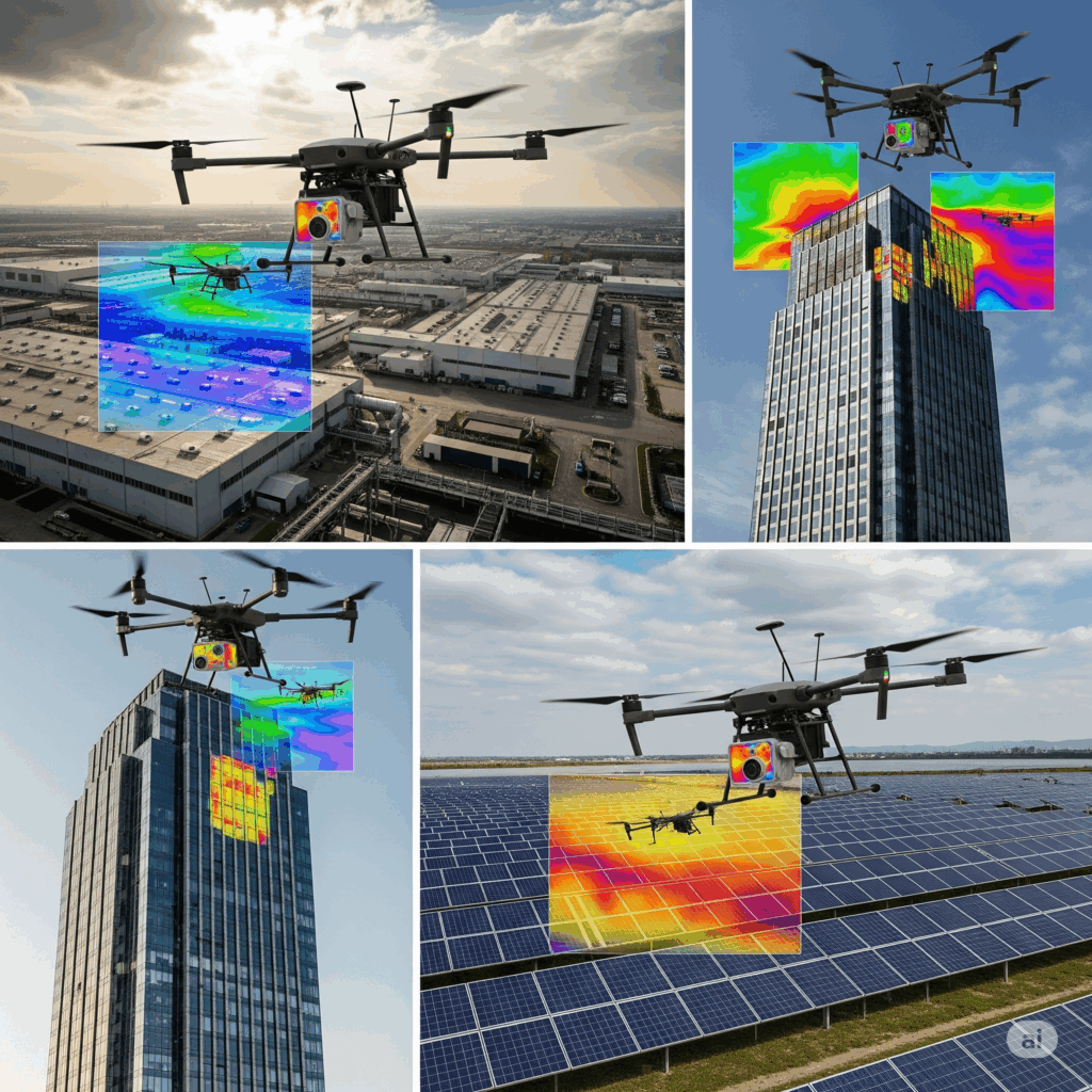 Drony wyposażone w kamery termowizyjne znacząco zwiększają możliwości inspekcji. Pozwalają dotrzeć do miejsc trudno dostępnych, takich jak dachy hal produkcyjnych, wysokie budynki czy rozległe farmy fotowoltaiczne.